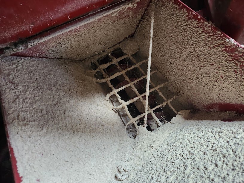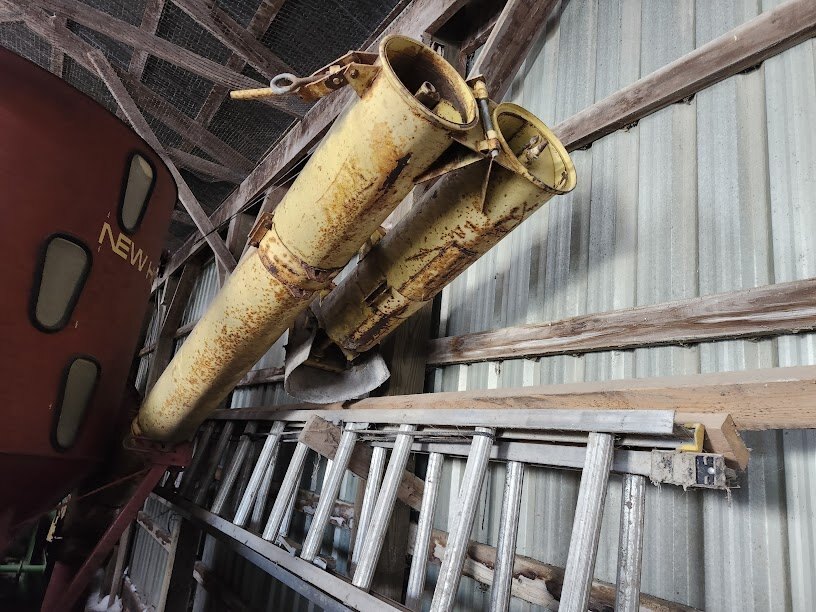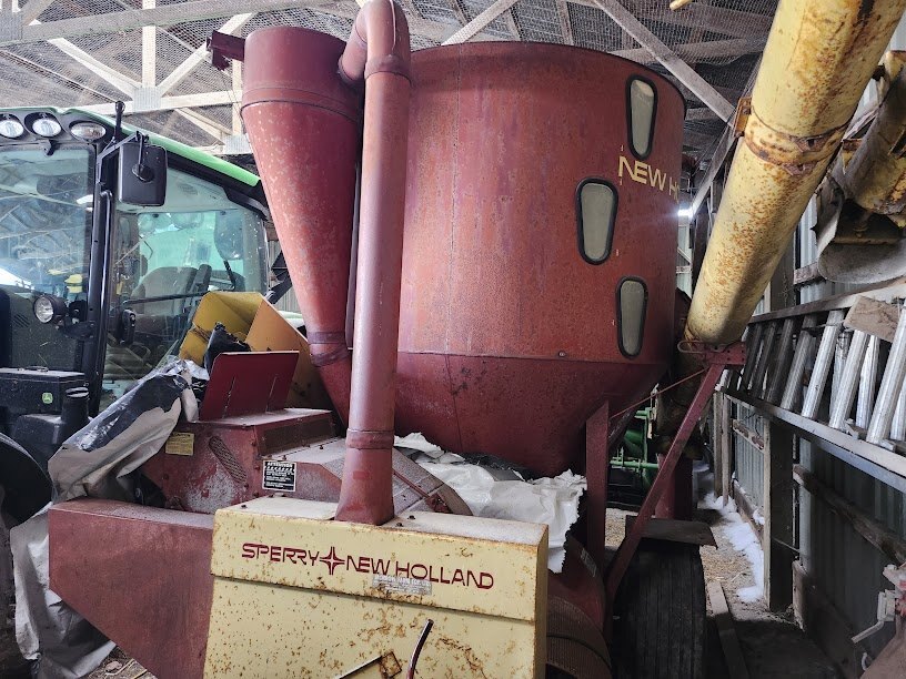 1981 New Holland grinder mixer, 155 bushel capacity, Loading auger, Unload auger with extension, Mechanical drive, 540 pto, 2 screens, Fenders, COMING
