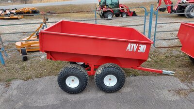 Brand New Creekbank ATV30 dump trailer, 48" x 66" box, 30 cubic foot capacity, Drop center floor, Walking tandem axles, AT22x11-8 knobby ATV tires,...