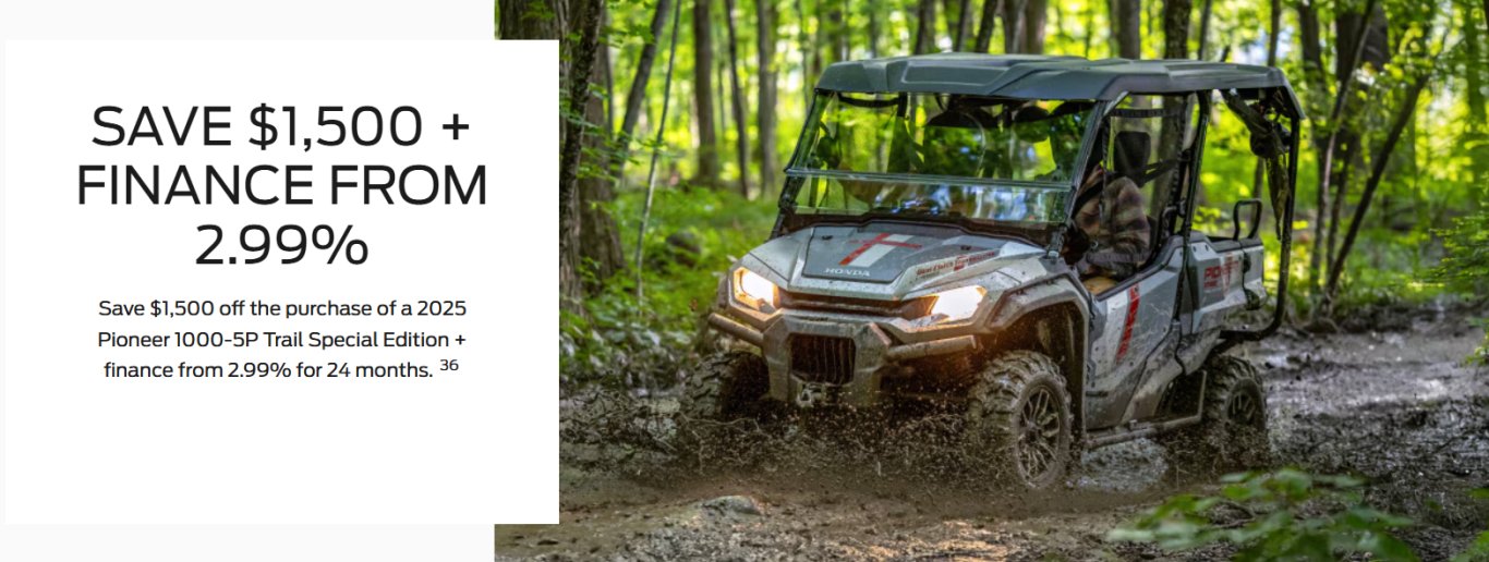 * * Representative finance example based on a 2025 Pioneer 1000-5P Trail Special Edition with a selling price of $35,383.50 (includes MSRP of $34,999.00, $1,760.00 freight (includes Logistics Surcharge), PDI and levies, lien registration fee [up to $90.00 in certain regions] and lien registering agent fee of $8.50, which are due at time of delivery and a $1,500 discount deducted from the manufacturer’s suggested retail price before taxes), with $0.00 down payment or equivalent trade-in required, financed at 2.99% APR equals $350.60 weekly for 24 months. 104 payments required. Cost of borrowing is $1,078.68 for a total obligation of $36,462.18. Taxes, license, insurance and registration [all of which may vary by region] are extra. Dealers may sell for less. Applicable fees may vary by region and dealer. Dealer order/trade may be necessary-but may not be available in all cases. See a participating authorized Honda dealer for full details, eligible models and other offers. Offer ends October 31, 2025, and is subject to change, extension or cancellation without notice. Models, colours, features and specifications may not be exactly as shown. Errors and omissions excepted.