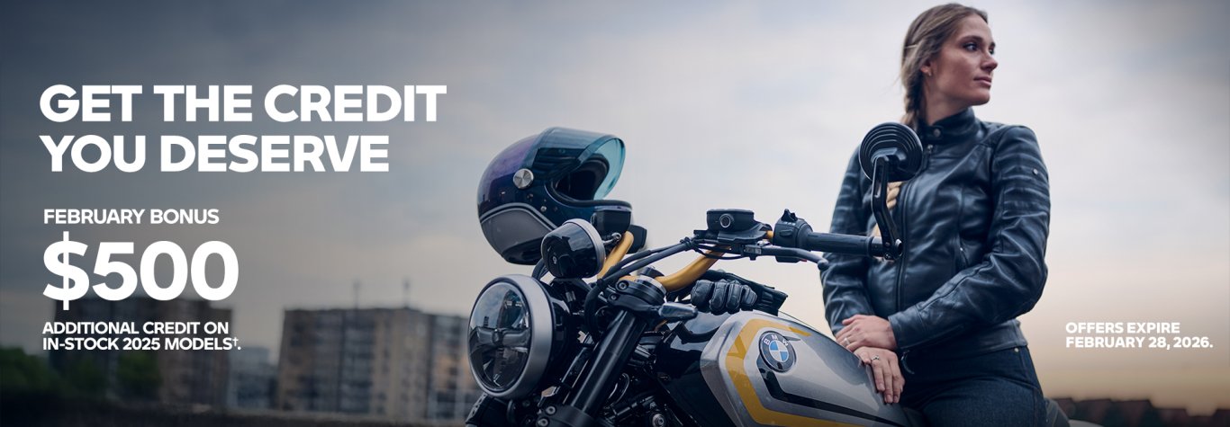†Credits up to $3,000 on select new in-stock 2024/2025 models. Offer expires February 28, 2026. Delivery must be taken by February 28, 2026. Credit will be applied towards the purchase price of the motorcycle. Credit may be combined with certain other in-market offers; however, cannot be combined with BMW Financial Services Supported Interest Rate Programs. Offer is subject to availability and may be cancelled or changed without notice. Certain conditions apply. See your local BMW Motorrad Canada Retailer for full details.