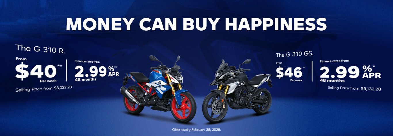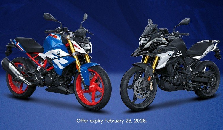 * Limited-time finance offer based on a new in-stock 2025 G 310 GS models available only through BMW Financial Services Canada on approved credit (OAC). Finance example: $7,095.00 with a $500.00 Fast Start credit financed at 2.99% APR for 48 months with $750.00 down payment equals a weekly payment of $46.52. Cost of borrowing is $525.49. Total of 208 weekly payments required. Total obligation is $8,952.02. Total selling price is $9,132.28, including MSRP of $7,095.00, a Fast Start Credit of $500, Freight & PDI, retailer administration fee, lender administration fee, Tire Recycling Fee and fees associated with PPSA (up to $2,537.28). Licensing, registration and applicable taxes are extra. Retailers may sell for less. Offer requires Retailer participation. Offer is subject to availability and may be cancelled or changed without notice. Certain conditions apply. See your local BMW Retailer for full details. ** Limited-time finance offer based on a new in-stock 2025 G 310 R models available only through BMW Financial Services Canada on approved credit (OAC). Finance example: $5,995.00 with a $500.00 Fast Start credit financed at 2.99% APR for 48 months with $600.00 down payment equals a weekly payment of $40.82. Cost of borrowing is $460.14. Total of 208 weekly payments required. Total obligation is $7,836.67. Total selling price is $8,032.28, including MSRP of $5,995.00, a Fast Start Credit of $500, Freight & PDI, retailer administration fee, lender administration fee, Tire Recycling Fee and fees associated with PPSA (up to $2,537.28). Licensing, registration and applicable taxes are extra. Retailers may sell for less. Offer requires Retailer participation. Offer is subject to availability and may be cancelled or changed without notice. Certain conditions apply. See your local BMW Retailer for full details. Offers expire February 28, 2026. Delivery must be taken by February 28, 2026. Offers are subject to availability and may be cancelled or changed without notice. Offers have no cash surrender or other value and cannot be applied to past transactions. Certain conditions apply. See your local BMW Motorrad Retailer or www.BMW-Motorrad.ca for full details.