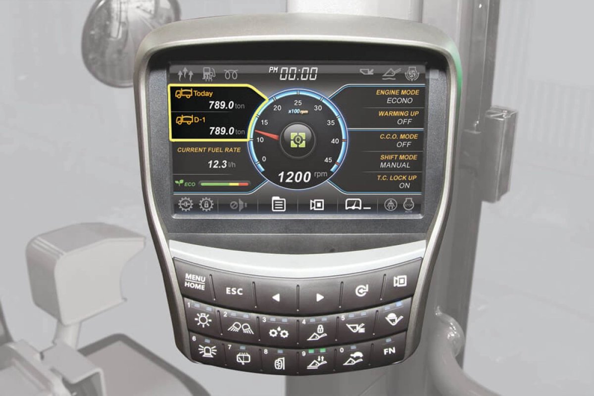 For operator safety, HL900 wheel loaders have a travel speed limit setting. New A-Series models now include an Emergency Stop Button and Seat Belt Warning Alarm.